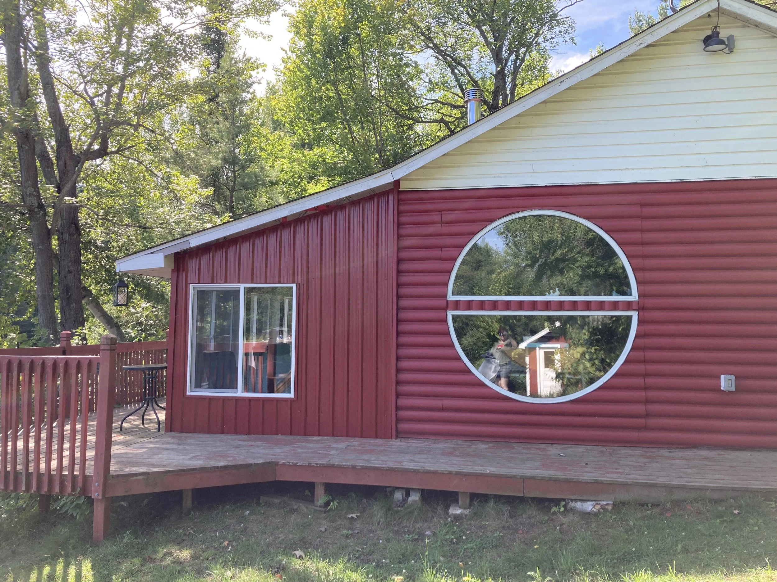 The Wee Red Cabin is a tiny 2-bedroom, 1-bath cottage on a private lot, bordered by road and forest on the west, a wooded area to the south, and the lake to the east. The nearest neighbour is to the north, about 100m away. There’s a private dock, a small deck, a patio with a firebox, and a gradual-entry gravel beach on the edge of the property.